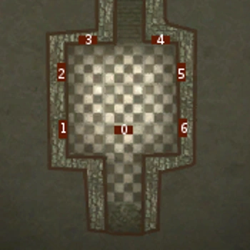 Um durch die Tür zu gelangen, muss Geralt im Raum herumgehen und alle Feuerstellen entzünden. Dabei muss er vorsichtig vorgehen, denn einige werden durch andere entzündet bzw. gelöscht. Die Feuerstellen sind mit einer bestimmten Anzahl Metallspornen, die über ihnen aus dem Mauerwerk ragen, von 1 bis 7 durchnummeriert.[1] Dabei zeigt die mittlere 4 Sporne (im Bild mit Nr. 0 markiert) und von dort aus links neben der Eingangstür beginnend wird auf der Grafik weiter im Uhrzeigersinn gezählt, wobei gilt: