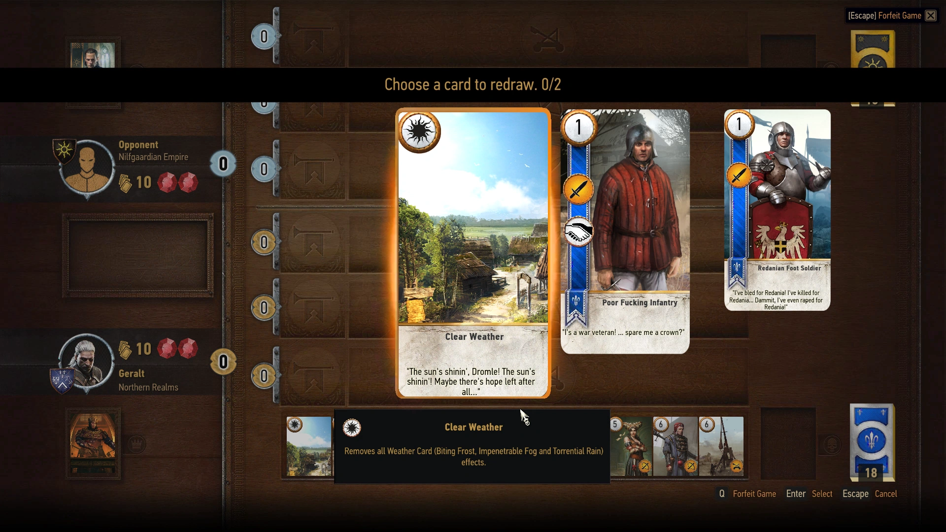 - Wetterkarten sind teilweise nützlich, da Sie ganze Reihen reduzieren, nicht nur, um die gegnerischen Punkte zu reduzieren, sondern auch, um starke Karten vor der Verbrennen-Karte zu schützen. Besonders nützlich für die Nördlichen Königreiche, mit ihren kräftigen Belagerungseinheiten.