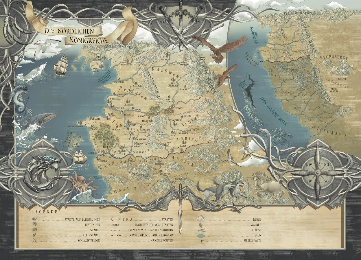 »Kannst du nicht. Noch niemand hat so eine Karte gezeichnet, und ich bezweifle, dass es bald jemand tut. Niemand weiß, was dort hinter den Feuerbergen und dem Großen Meer liegt. Nicht einmal die Elfen, obwohl sie sich brüsten, alles zu wissen. Einen Scheiß wissen sie, sag ich dir.«