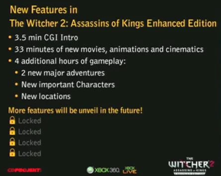 Neu für die Xbox sind vier zusätzliche Spielstunden im dritten Akt mit neuen Quests, Orten und drei neuen Charakteren. Diese Extras werden für PC-Spieler am Tag der Konsolenveröffentlichung kostenlos herunterzuladen sein. Für PC-Spieler, die The Witcher 2: Assassins of Kings noch nicht haben, ist die digitale Version bis zum 10.02.2012 über die Schwesterfirma GOG.com erhältlich – mit 15% Preisnachlass erhältlich.