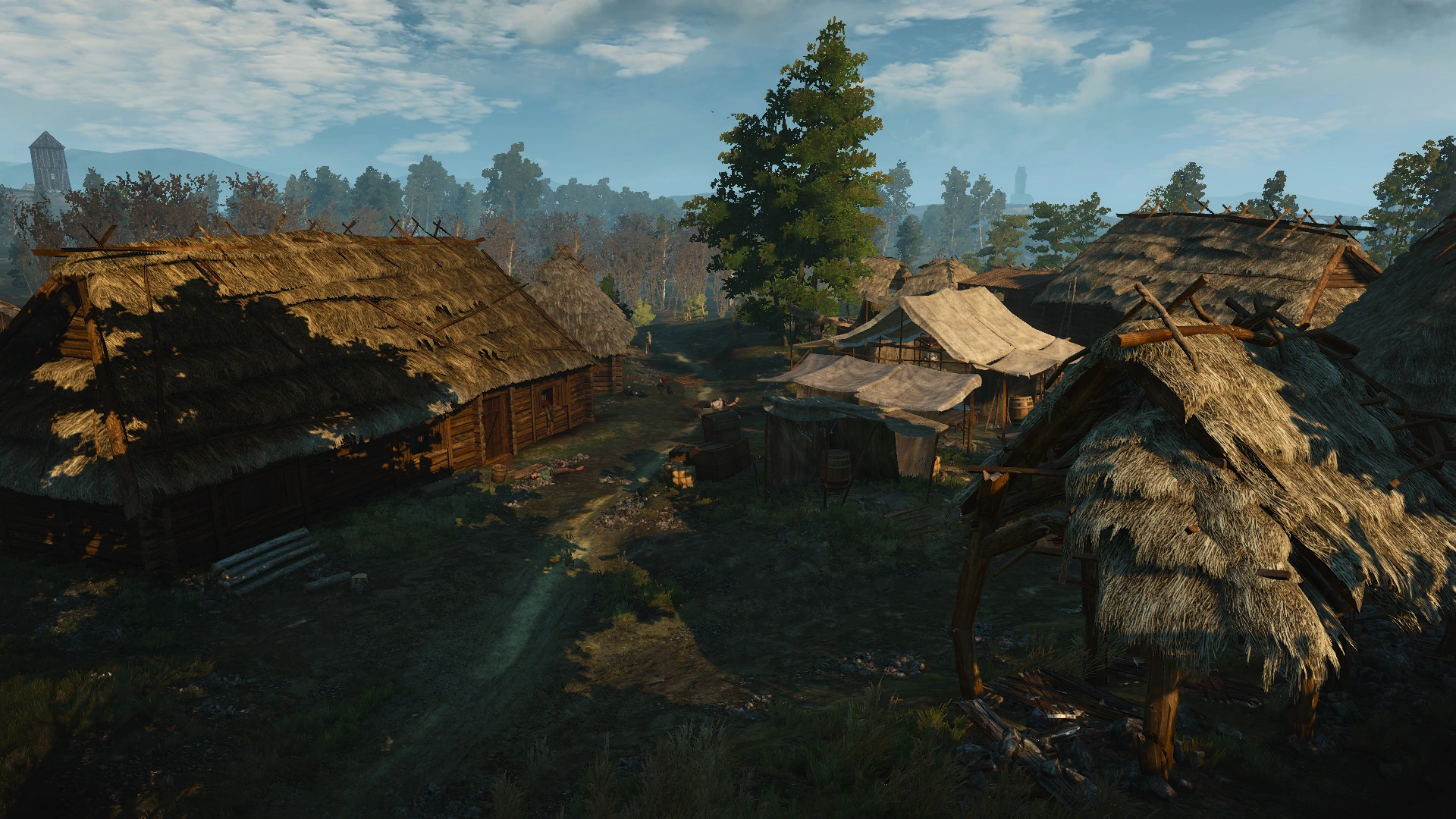 - Wenn Geralt das Dorf das erste Mal betritt, trifft er auf eine Gruppe von Dörflern bzw. Marrodeuren, die gerade Beute unter sich verteilen. Dieses Ereignis ist mit einem Ausrufezeichen auf der Karte markiert, obwohl es keine Quest im Questlog erzeugt. Der Hexer kann sich entscheiden: