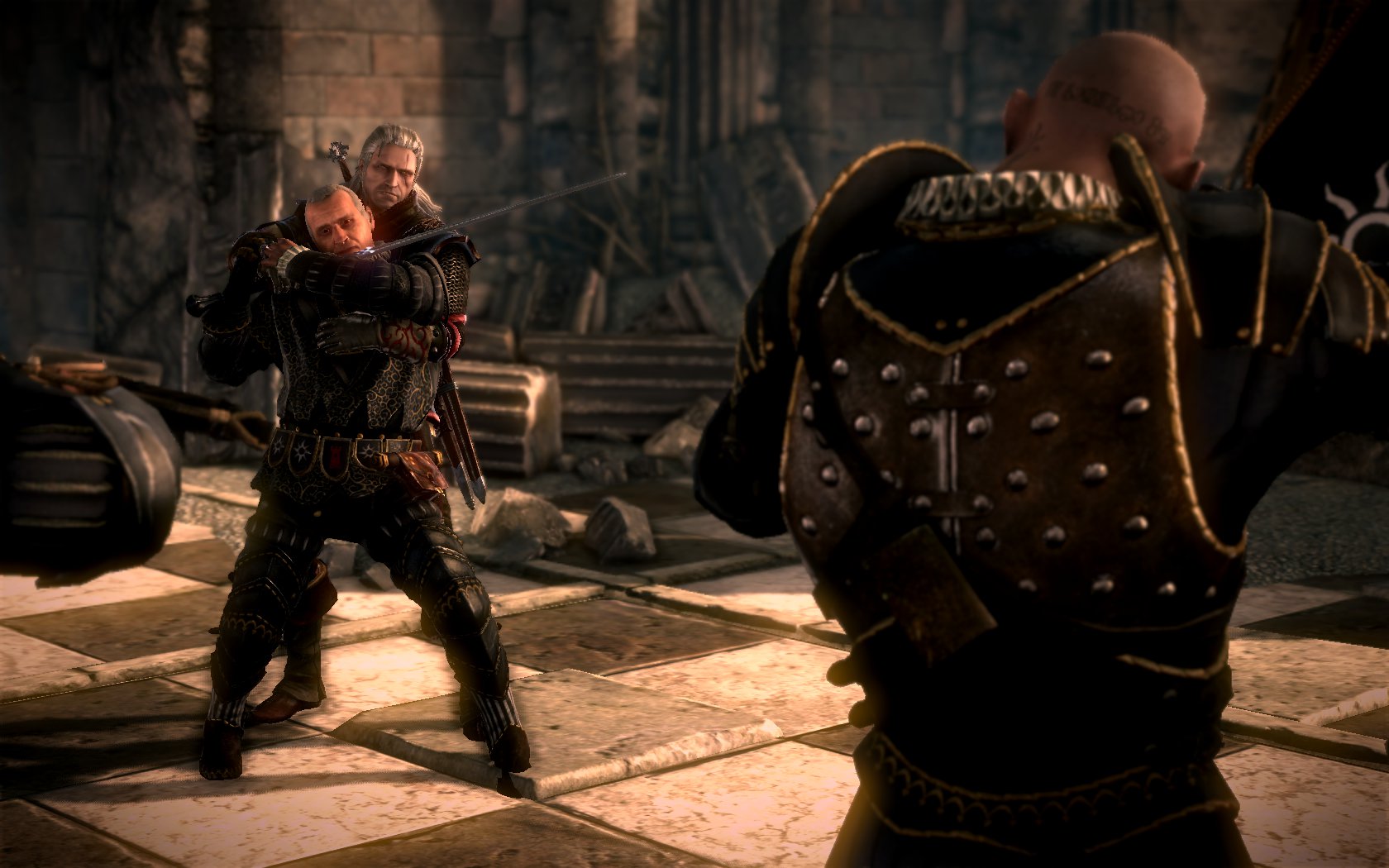 In dem Gebiet, in das wir nun hineingeraten sind, befindet sich der Kerker, in dem Triss gefangen ist. Doch bevor wir sie befreien können, müssen wir eine heftige Welle von Nilfgaardern abwehren und uns im wahrsten Sinne des Wortes zu Renuald durchschlagen. Der lässt sich von zwei harten Burschen mit Schild beschützen, während er uns in ein mehr oder weniger interessantes Gespräch verwickelt.