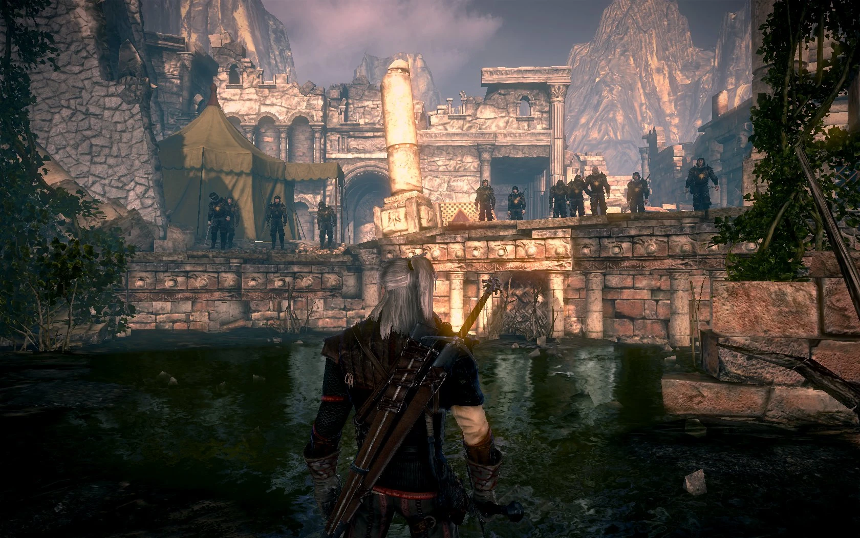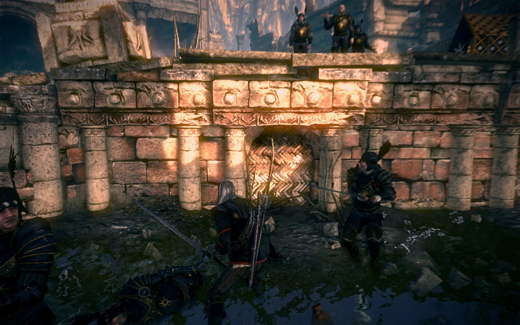 Seines Schildes beraubt bleibt Geralt nun nichts anderes übrig, alle die sich in seinen Weg stellen umzubringen. Renuald lässt uns vorerst mit seinen Männern allein, aber wir haben auch genug zu tun. Nach dem das erledigt ist, gibt es nur einen Weg: weiter über eine Leiter nach oben, wo zwei Armbrustschützen aus eigener Schuld nicht flüchten. Zwei weitere Sprünge abwärts offeriert sich uns ein netter Ausblick: Ein bildschöner Weiher, umrandet von schönen Pflanzen und an einer Uferseite ein Gebäudekomplex... auf dem massenweise Nilfgaarder und Renuald auf uns warten. Hier ist eine gute Vorbereitung auf einen heftigen Kampf angeraten, wenn man nicht gerade auf 'leicht' spielt.