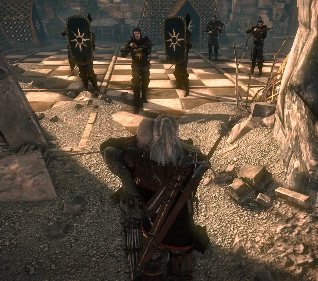 Geralt hat nun Shilard in seiner Gewalt und lässt sich von ihm durch die Kanalisation in das sonst gut abgeriegelte Lager der Nilfgaarder führen. Das Schild erweist sich jedoch recht schnell als unbrauchbar, denn Renuald aep Matsen, selbst intrigant genug, um Shilard vor dem Kaiser auszubooten, bringt diesen kurzerhand durch einen Armbrustschuss um - eine Wohltat, die uns nur in diesem Questzweig geboten wird.